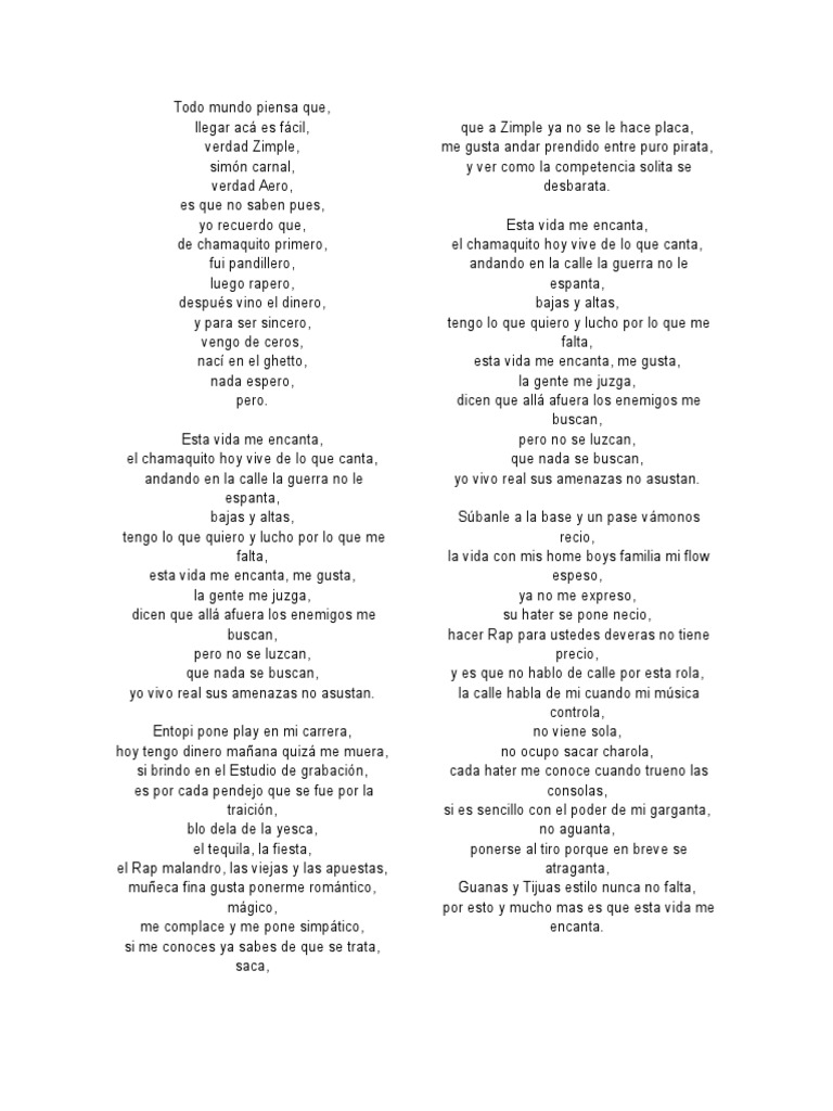 Esta Vida Me Encanta C Kan Letra Da Musica Palco Mp3 Esta vida me encanta, el chamaquito hoy vive de lo que canta, andando en la calle la guerra no le espanta, bajas y altas, tengo lo que quiero y lucho avisa, que el kan aterriza, que ando en verguiza, con el ojo rojo y risa, en bisnes con el hyde el del gran y en la repisa, revisa, la agenda rostizo todo el.